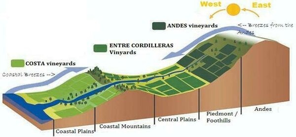 Ehkki vahemaa läänest-itta pole teab kui suur, keskmiselt vaid 177km, siis joonistuvad ka niipidi selgelt välja erinevad pinnasetüübid, mida aitab mõista kõrvalolev joonis. Igaks juhuks kirjutan kasutatud mõisted ka eesti keeles lahti. Vaikse ookeani poolt liikudes on esmalt rannikutasandik, millele järgneb rannikuahelik ehk rannikulähedane mägine ala. Neid alasid mõjutab oluliselt ookeani lähedus, mis hoiab temperatuuri madalamana ning ookeanilt tulev briis samuti jahutab ning ventileerib sealseid viinapuuaedu. Selle osa nimi on Costa ehk rannik.